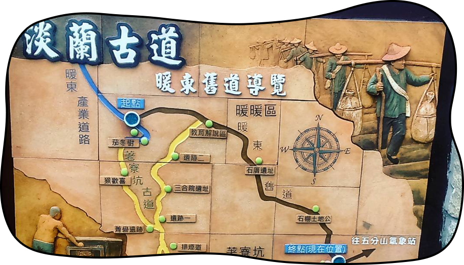 淡蘭古道起自基隆河河道旁的暖暖地區,沿河道旁的小徑東行,越過三貂嶺、草嶺山區,至蘭陽地區大里、石城附近,全程長約80餘公里;這條孔道最初是平埔族凱達格蘭人的遊獵山徑,後來漸漸演變成昔日淡水廳(台北)與噶瑪蘭廳(宜蘭)兩個地方之交通、移民、生意等來往要道,人們稱此條因拓墾移居而踩踏出的道路為淡蘭古道。